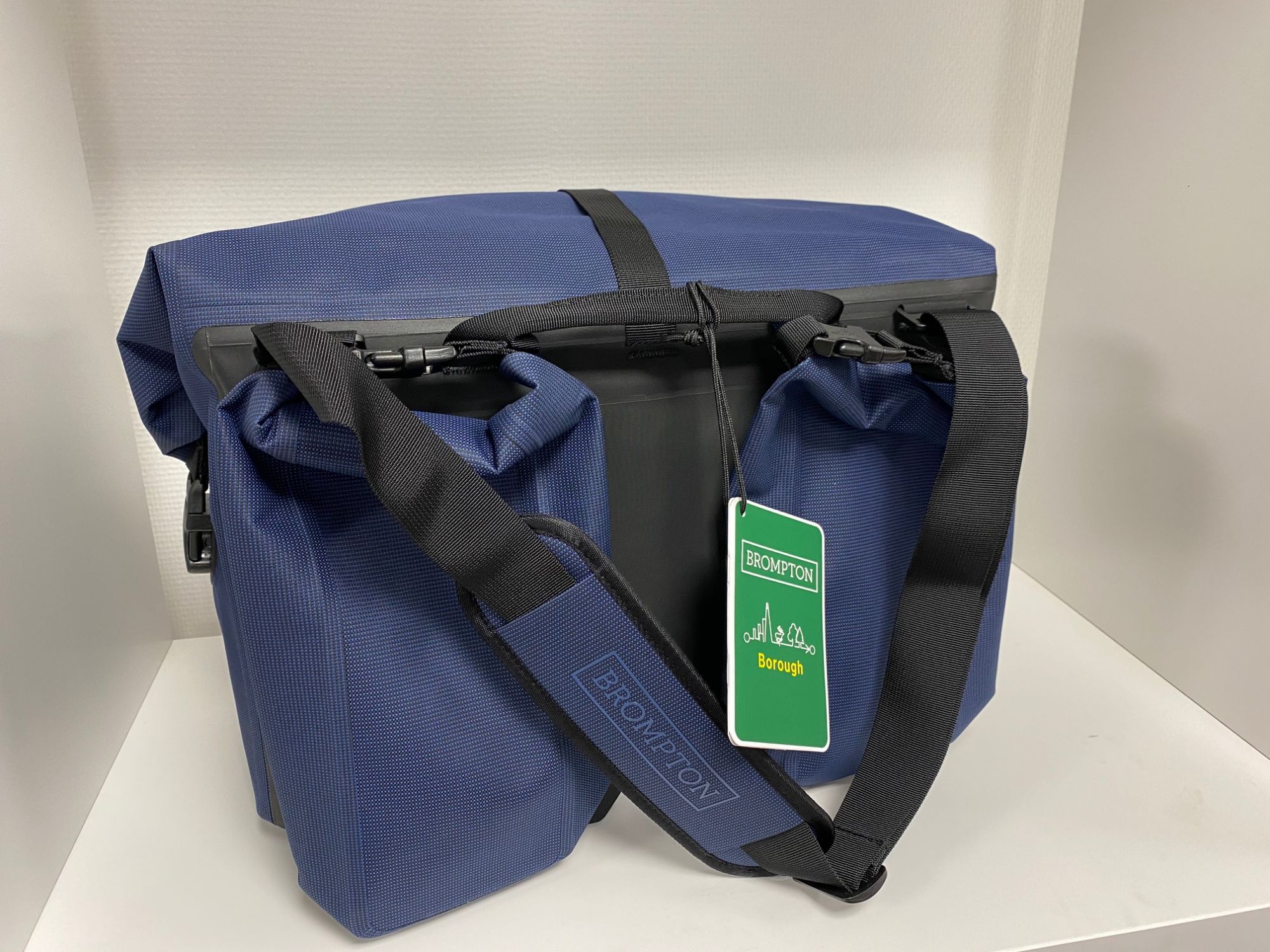 Der marineblaue Borough Waterproof Large Bag ist der größte der imprägnierten Brompton-Bags. Diese großzügige, komplett wasserfeste Rolltop-Tasche bietet genug Stauraum für alles Reisenotwendige und Schutz auch bei den widrigsten Wetterbedingungen.