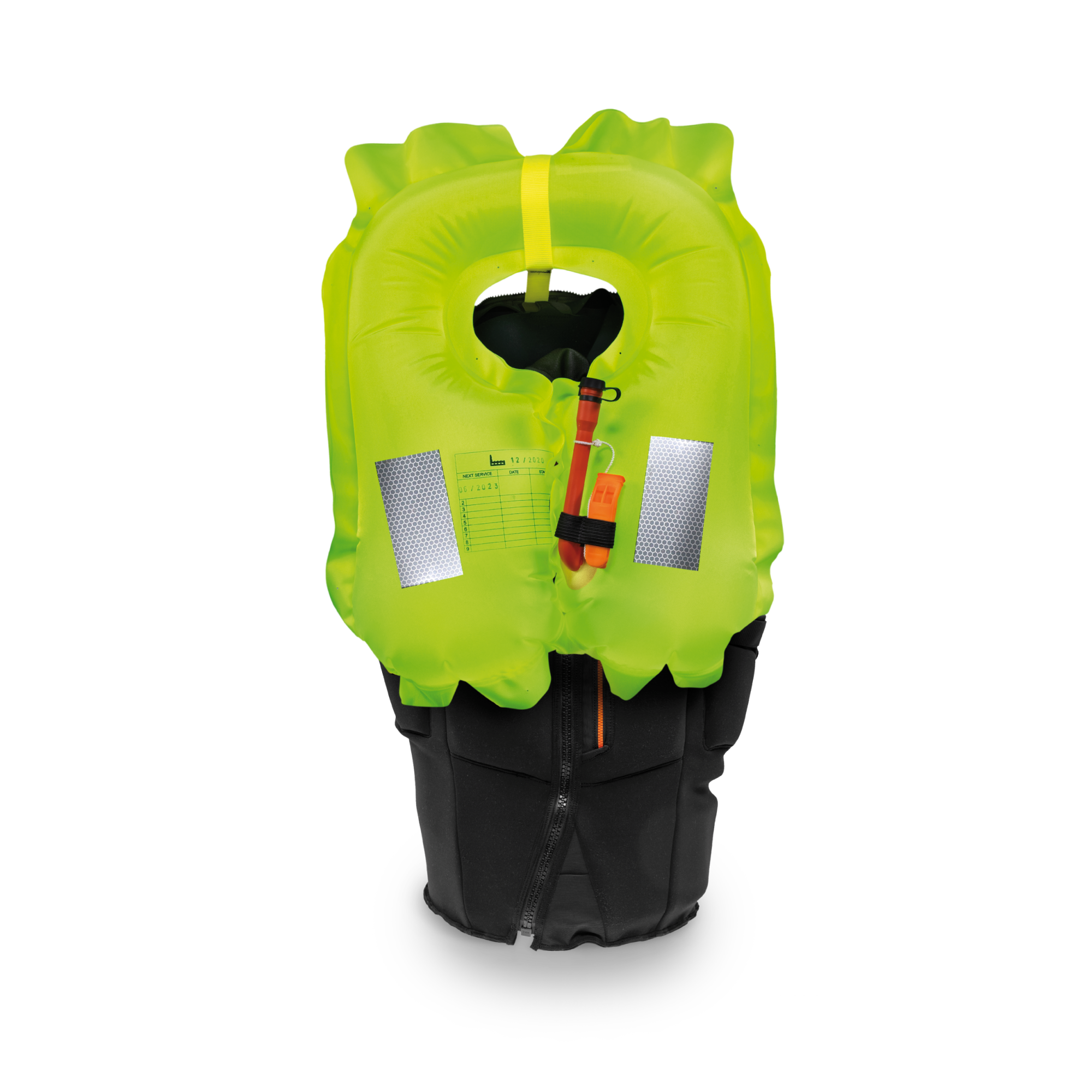 - Schnelle Stabilisierung von Mensch und Weste dank des vollwertigen aufblasbaren Rettungswesten-Schwimmkörpers. Der Kopf und die Atemwege bleiben nach Auslösung oberhalb der Wasserfläche – auch bei eintretender Bewusstlosigkeit.