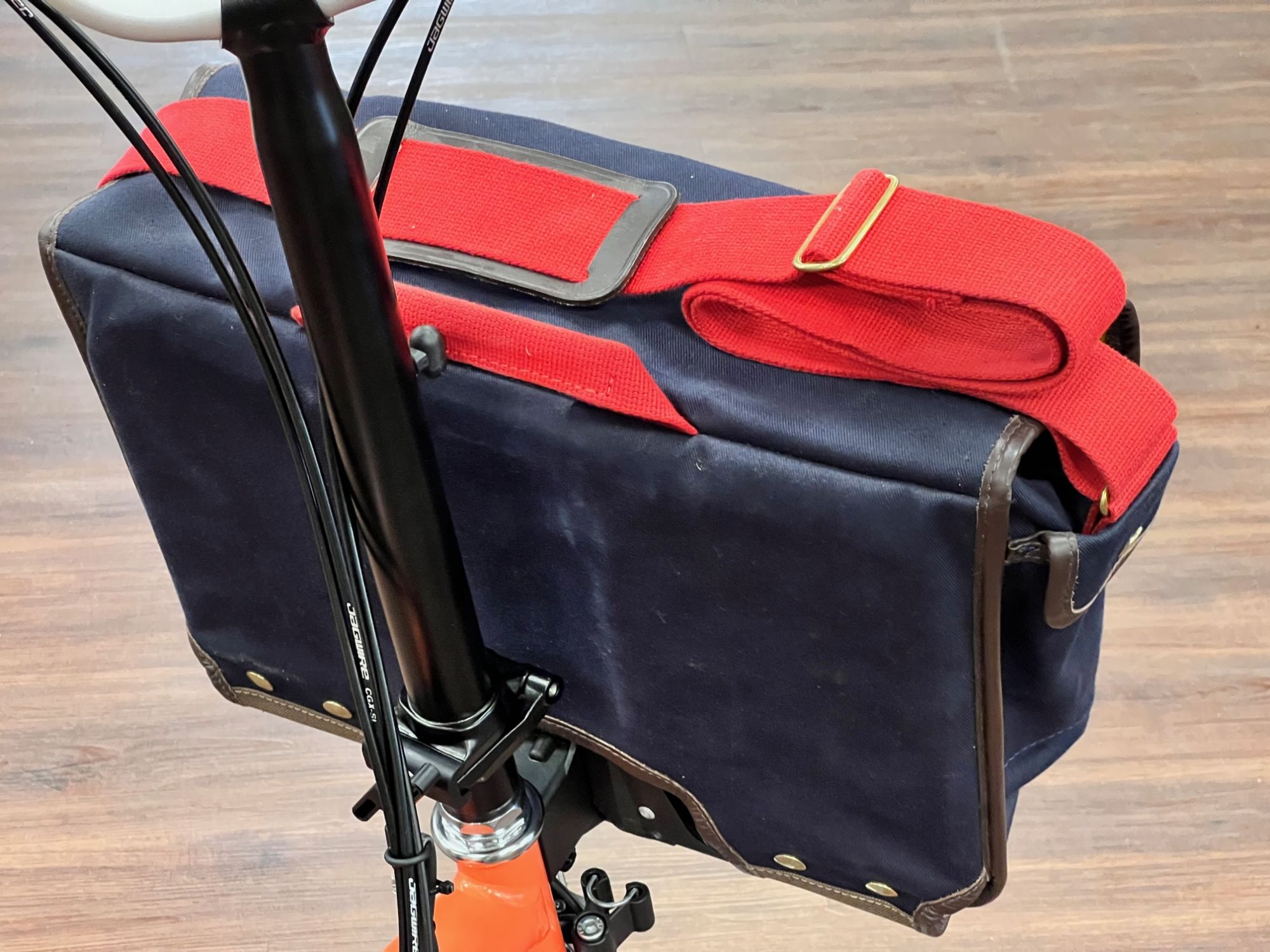 - Der Game Bag kann über einen an den Rahmen aufgeschraubten Trägerblock direkt am Brompton befestigt werden.