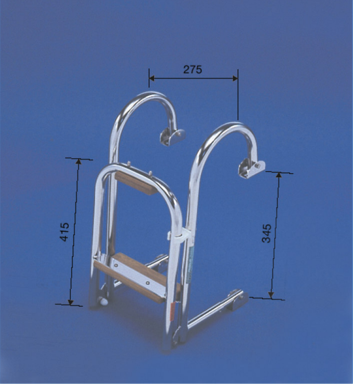 LÜBECK-A Leiter aus polierten und rostfreien Edelstahlrohren mit 25 mm Ø. Die Stufen sind mit Teakholzleisten belegt. Die U-förmigen Halter passen sich fast jeder gewünschten Spiegelneigung an. Die beiden unteren Abstandhalter sind drehbar und in der Länge bis zu 235 mm ausziehbar. Nutzlänge: 760 mm Beachten Sie bitte Leiter LÜBECK-B, Bild 211.