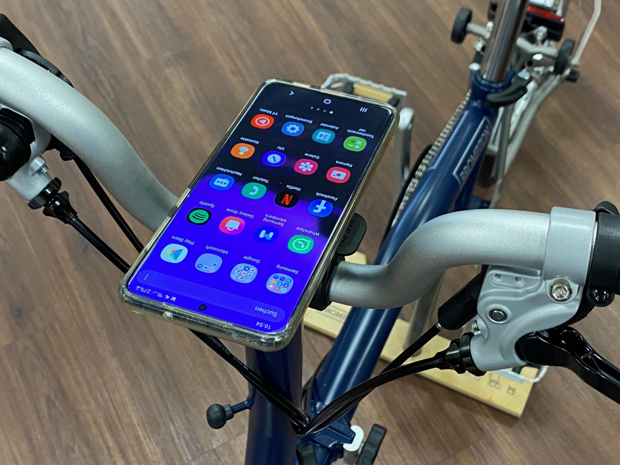 Endlich gibt es eine stabile Handy Halterung extra von Quadlock für das Brompton entwickelt. Es wird links und rechts von der Lenkerfixierung auf Dauer montiert und stört weder bei der Faltung noch bei eventuellen Lenkertaschen.