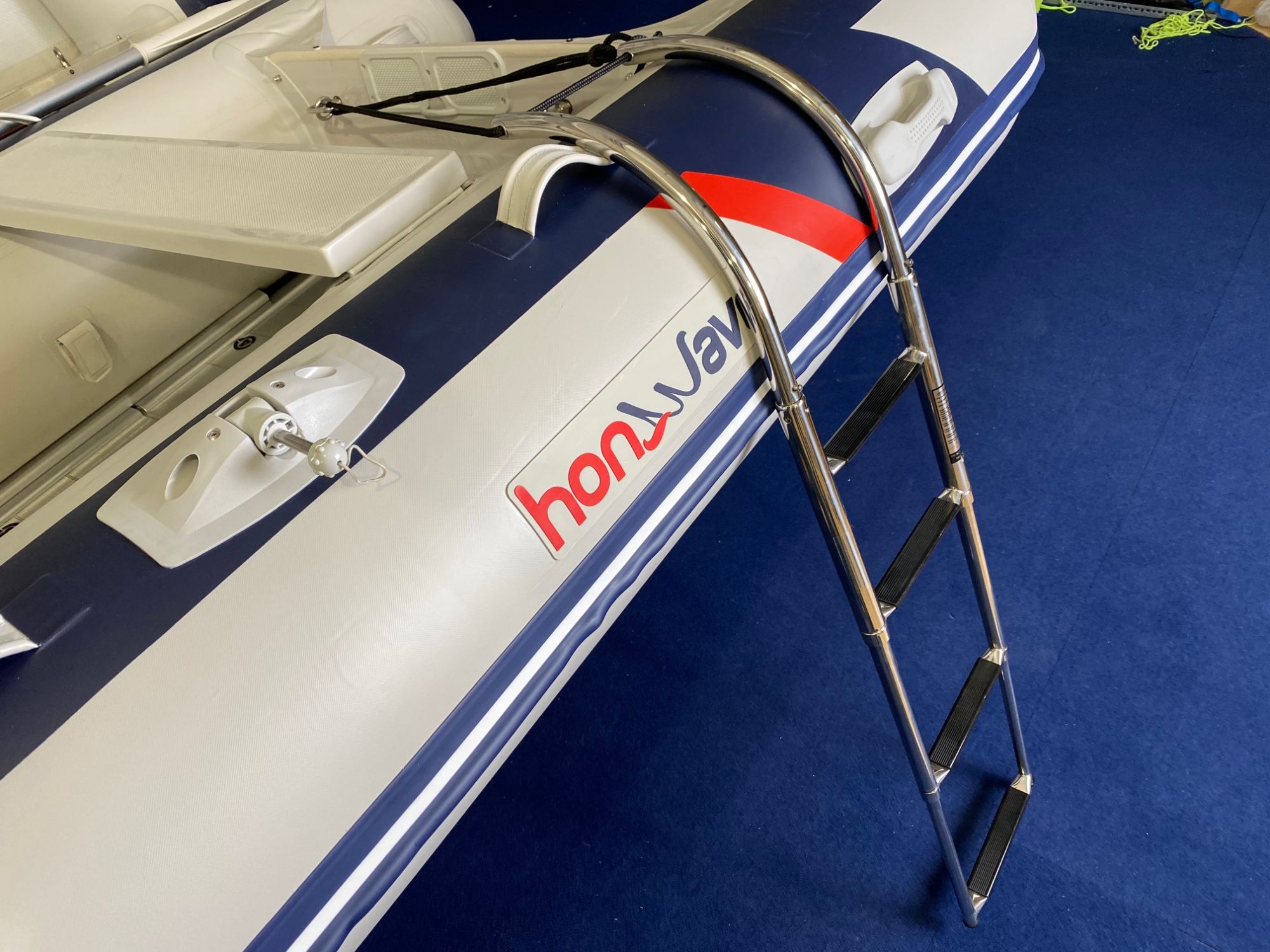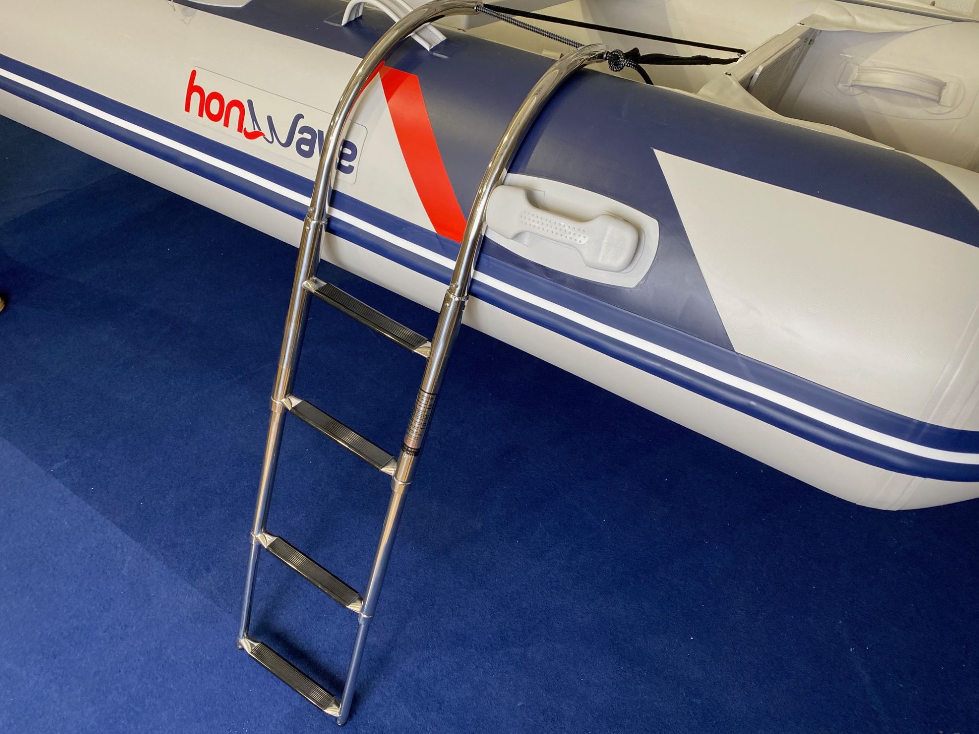 Die Leiter wird einfach seitlich an das Schlauchboot angebunden (Halteöse an der Motorplatte) und kann bei der Benutzung nicht unters Boot wegklappen (Strickleitereffekt) und kann nicht seitlich wegrutschen durch die sichere Auflage auf dem Schlauch!
